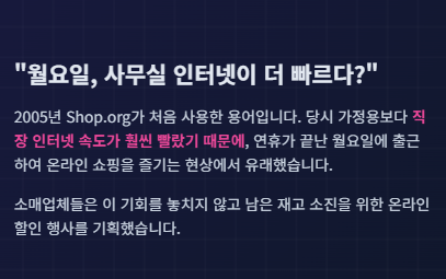 • 사이버 먼데이는 2005년 미국 소매업계의 연합인 Shop.org가 처음 사용한 용어입니다.