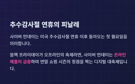 - 현재는 블랙 프라이데이와 사이버 먼데이가 사실상 합쳐져 '사이버 위크(Cyber Week)'라는 형태로 일주일 내내 온라인 할인이 지속되는 추세입니다. 이는 옴니채널(Omni-Channel) 쇼핑 전략이 보편화되었음을 보여줍니다.
