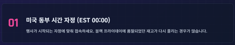 - 재고 소진 대비: 블랙 프라이데이에 놓쳤거나 품절된 재고가 사이버 먼데이에 다시 풀리는 경우가 많습니다. 위시리스트를 미리 정리하여 자정(미국 동부 시간 기준)을 기점으로 빠르게 구매를 시도하는 것이 성공적인 쇼핑 전략입니다.