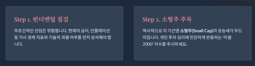 2단계: '소형주'의 강세 가능성을 염두에 두라 역사적으로 산타 랠리 기간에는 대형주보다는 소형주(Small Cap)의 상승률이 더 두드러지는 경향이 있었습니다. 소형주는 유동성이 낮아 상대적으로 적은 매수세에도 주가 움직임이 클 수 있으며, 개인 투자자들의 연말 매수 심리에 더 민감하게 반응할 수 있기 때문입니다. 소형주 중심의 러셀 2000 지수를 분석하면서, 내년 성장이 기대되는 섹터의 소형주를 선별적으로 고려하는 것이 하나의 전략이 될 수 있습니다.