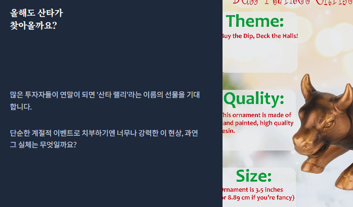 그 이유는 바로 금융 시장에 존재하는 '산타 랠리(Santa Rally)'라는 현상 때문입니다.