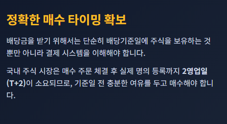 - 매수 시점: 배당기준일(보통 12월 말)의 2영업일 전까지 매수 필수입니다.