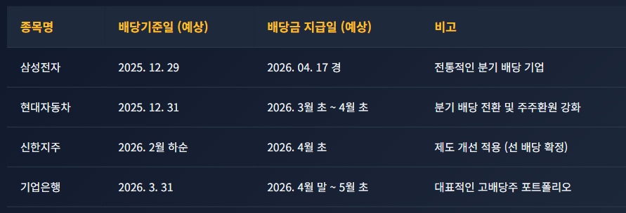 | 삼성전자 | 2025년 12월 29일 | 2026년 4월 17일경 | 분기 배당 실시 기업 |