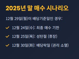 국내 주식은 매수 주문 체결 후 실제 내 명의로 등록되기까지 2영업일(T+2)이 소요됩니다. 따라서 배당기준일로부터 2영업일 전까지는 매수를 완료해야 합니다. 예를 들어 2025년 12월 29일(월)이 배당기준일이라면, 늦어도 12월 24일(수)까지는 주식을 사야 배당 권리를 얻을 수 있습니다. (25일 성탄절 휴장 기준)