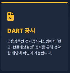 - 금융감독원 전자공시시스템(DART): 검색창에 기업명을 입력하고 ‘현금·현물배당결정’ 공시를 확인하면 배당금 액수와 지급 예정일을 알 수 있습니다.