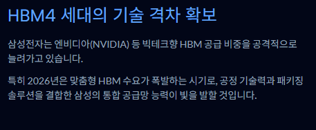 첫 번째는 HBM(고대역폭 메모리) 시장의 주도권 탈환입니다. 삼성전자는 엔비디아(NVIDIA) 등 글로벌 빅테크 기업으로 HBM3E 12단 제품 공급을 본격화했으며, 차세대 제품인 HBM4에서도 기술 경쟁력을 회복하고 있습니다. 특히 2026년에는 HBM4 주문이 급증하며 수익성이 극대화될 것으로 보입니다.
