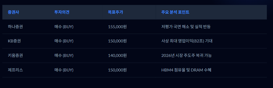 국내외 주요 증권사들은 삼성전자가 2025년의 부진을 딛고 2026년에는 역대급 실적을 기록할 것으로 내다보고 있습니다. 반도체 슈퍼 사이클의 귀환이 주가 상승의 가장 큰 동력입니다.