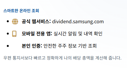 삼성전자는 주주들의 편의를 위해 온라인으로 배당 내역을 간편하게 확인할 수 있는 전용 서비스를 제공하고 있습니다. 우편으로 발송되던 배당 통지서 대신 스마트폰이나 PC로 실시간 조회가 가능합니다.