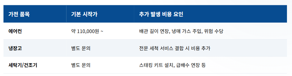 • 에어컨: 홈멀티(2 in 1), 스탠드형, 벽걸이형에 따라 기본 설치비가 다르며, 배관 길이나 냉매 주입 여부에 따라 추가 자재비가 발생할 수 있습니다. (기본 설치비 약 110,000원 선부터 시작)