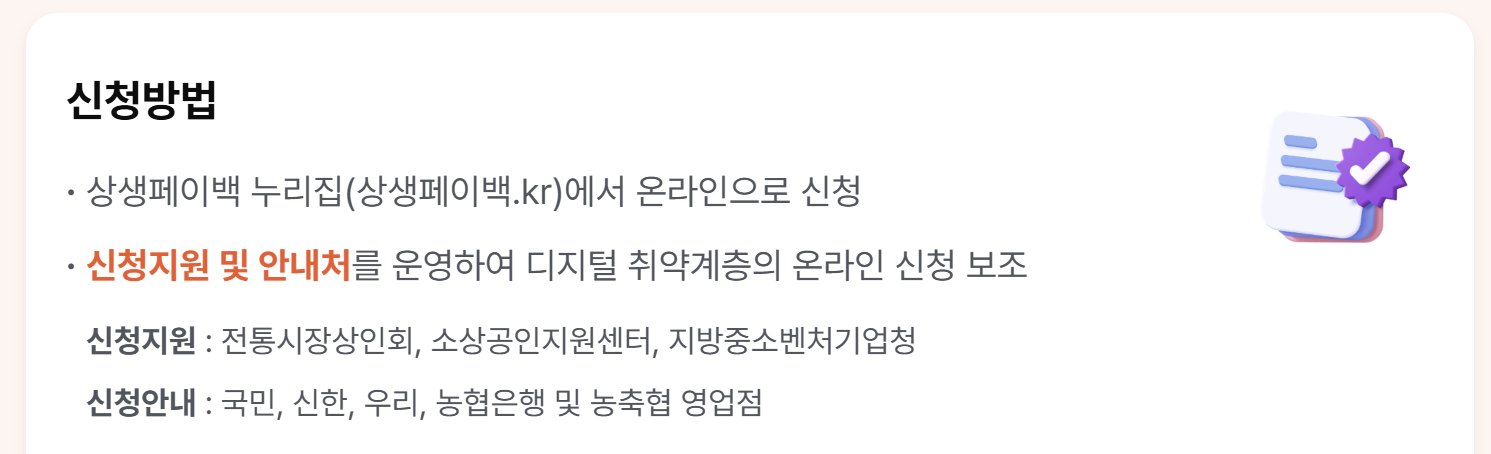 - 온라인 원칙: 상생페이백은 온라인 신청이 원칙이며, 오프라인 신청은 디지털 취약계층만 예외적으로 지원받을 수 있습니다.