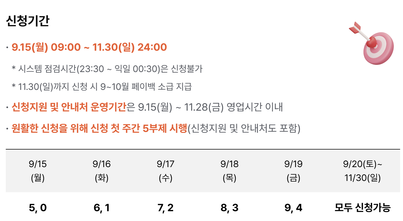 신청은 9월 15일 오전 9시부터 11월 30일 자정까지 가능하며, 신청 첫 주에는 혼잡을 막기 위해 출생연도 끝자리에 따른 5부제가 시행됩니다. 9월 20일부터는 요일 제한 없이 누구나 신청할 수 있습니다.