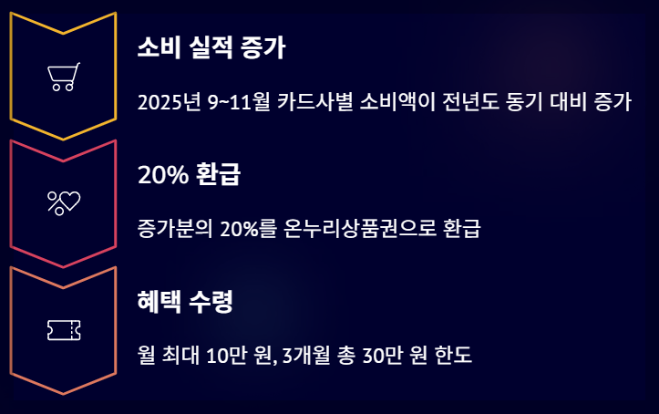 - 2025년 9~11월 카드사별 소비액이 전년도 동기 대비 늘었을 경우, 증가분의 20%를 온누리상품권으로 환급(월 최대 10만 원, 3개월 30만 원 한도)