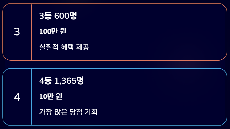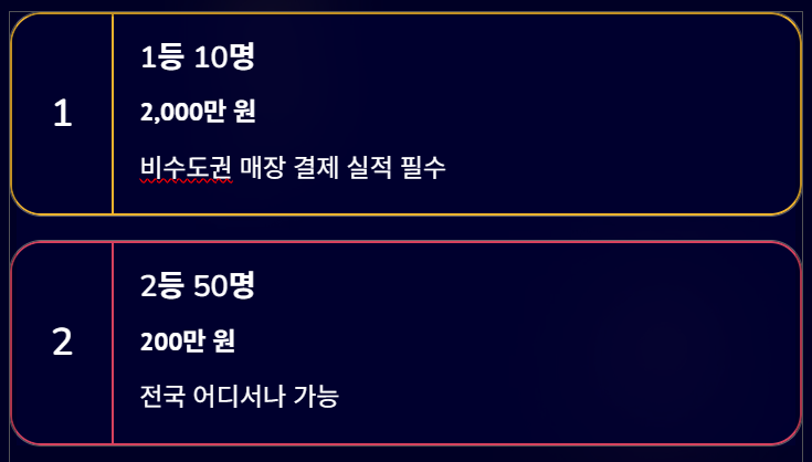 - 1등 10명: 2,000만 원(비수도권 매장 결제 필수)