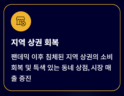 - 팬데믹 이후 침체된 지역 상권의 소비 회복 및 특색 있는 동네 상점, 시장 매출 증진