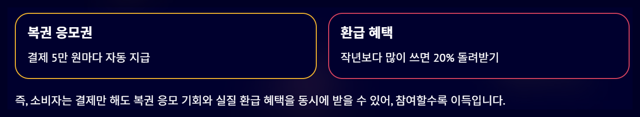 - 즉, 소비자는 결제 5만 원마다 복권 응모권도 받고, 작년보다 많이 썼다면 실질적으로 환급까지 받을 수 있어 혜택이 두 배로 확대됩니다.
