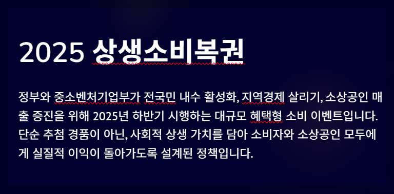 상생소비복권은 정부와 중소벤처기업부가 전국민 내수 활성화, 지역경제 살리기, 소상공인 매출 증진을 위해 2025년 하반기 시행하는 대규모 혜택형 소비 이벤트입니다. 단순 추첨 경품 이벤트가 아니라, 사회적 상생 가치를 담아 소비자와 소상공인 모두에게 실질적 이익이 돌아가도록 설계된 것이 특징입니다.