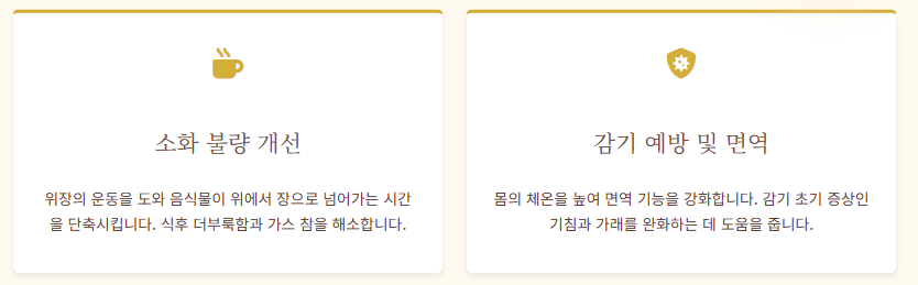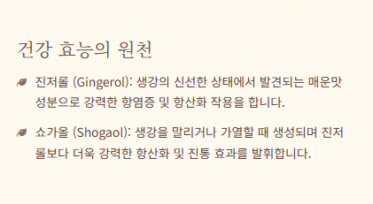 • 생강은 위장의 연동 운동을 촉진하여 소화 불량 증상을 개선합니다. 위가 비워지는 속도를 빠르게 하여 더부룩함을 줄여줍니다.