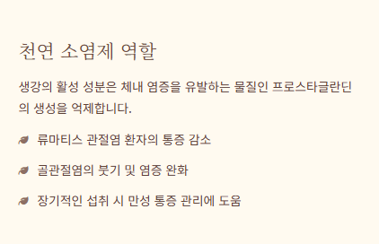 - 이는 관절염(류마티스 관절염, 골관절염) 환자의 통증과 붓기를 줄이는 데 도움을 줄 수 있다는 연구 결과들이 있습니다.