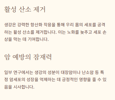 - 생강은 강력한 항산화 작용을 통해 세포 손상을 일으키는 활성 산소를 제거합니다.