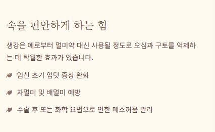 - 생강은 특히 멀미나 입덧으로 인한 오심 및 구토 증상을 완화하는 데 탁월한 효과를 보입니다.
