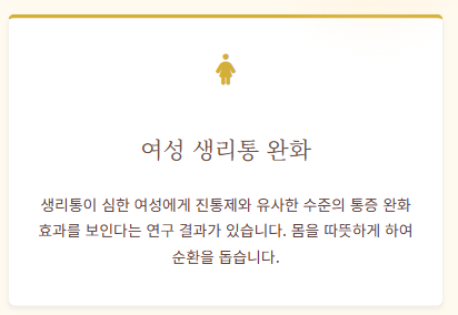 - 여성의 생리통(월경통) 완화에도 진통제와 유사한 효과를 보이는 것으로 알려져 있습니다.