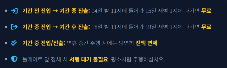 결론부터 말씀드리면, 고속도로에 들어온 시간이나 나간 시간 중 단 한 번이라도 면제 기간(2/15~2/18)에 포함된다면 통행료는 전액 면제됩니다.