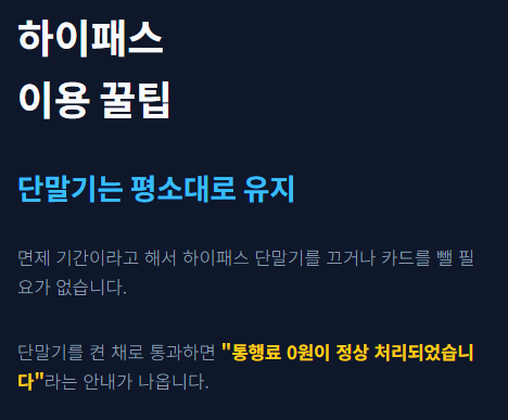 - 하이패스 차량: 단말기를 켠 상태로 하이패스 차로를 통과하세요. "통행료 0원이 정상 처리되었습니다"라는 안내 멘트가 나옵니다.