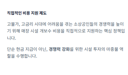 - 현물 (70%): 나머지 700만 원은 사장님이 이미 지출하고 있는 임차료, 인건비, 신규 기자재 구입비 등으로 대체가 가능합니다. 사실상 매달 나가는 월세와 인건비로 자부담을 채울 수 있어 실제 현금 부담은 매우 낮습니다.