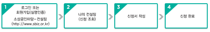 • 신청접수 ▷ 사전진단 ▷ 컨설턴트 선정 ▷ 컨설팅 수행 ▷ 컨설팅 결과보고 ▷ 컨설팅 비용지급