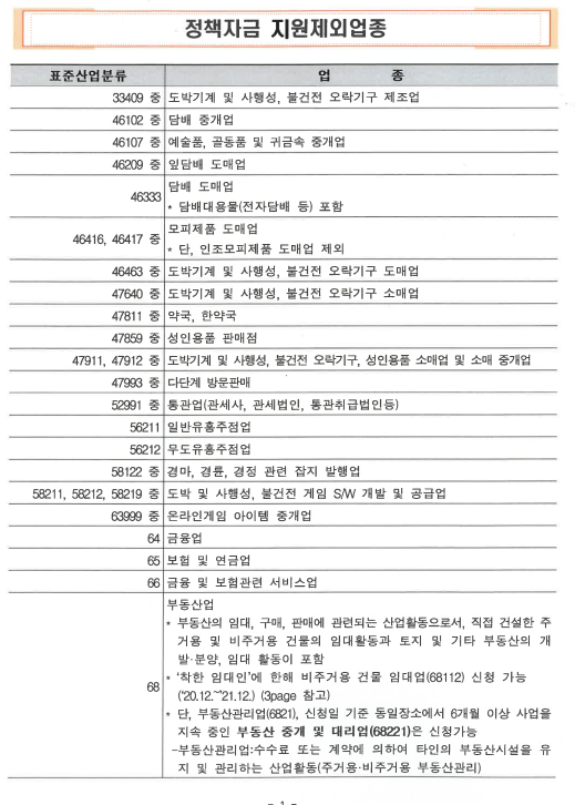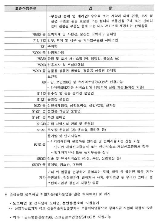 • 소상공인정책자금 지원제외 업종, 사치향락적 소비·투기 조장 업종 등