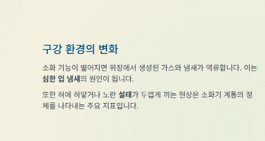 소화되지 못한 내용물이나 가스가 위쪽으로 이동하면서 구강 환경에 변화를 일으킵니다.