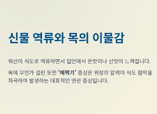 - 신물 역류와 목의 이물감: 위산이 식도로 역류하면서 입안에서 쓴맛이나 신맛이 느껴지고, 목에 무언가 걸린 듯한 '매핵기' 증상이 나타나기도 합니다.