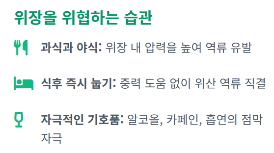 - 생활 규칙: 식후 즉시 눕지 않기, 자극적인 음식 피하기, 적정 체중 유지