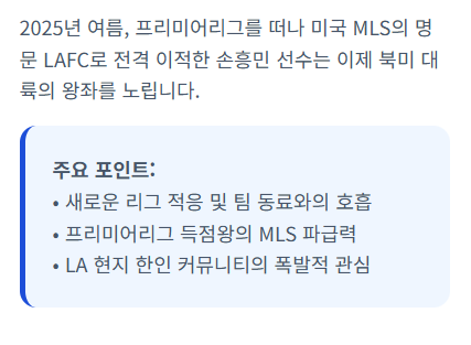 2026년은 손흥민 선수에게 새로운 도전의 해이자, 축구 역사에 남을 거대한 이벤트들이 기다리는 중요한 시점입니다. 2025년 여름, 전격적으로 미국 메이저리그 사커(MLS)의 LAFC로 이적하며 축구 인생의 새로운 챕터를 연 손흥민 선수는 이제 미국 정복과 더불어 다가올 2026 북중미 월드컵을 정조준하고 있습니다.