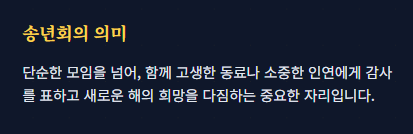 함께 고생한 동료나 소중한 인연에게 감사를 표하고 새로운 해의 희망을 다짐하는 중요한 자리입니다.