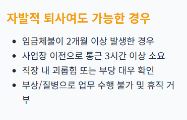 | 이직 사유 | 비자발적 이직 (권고사직, 계약만료 등) | 정당한 사유 시 자진퇴사 허용 |