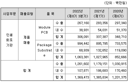 심텍은 반도체용 인쇄회로기판은 전문적으로 판매하는 회사입니다. 이전 사진들을 보셨겠지만 컴퓨터와 노트북에 많이 들어가는 회로판들이 많습니다. 매출실적을 보면 2020년도부터 점점 매입액이 증가하였으나 2022년에는 조금 줄었습니다. 2023년에는 더욱 성장할 전망으로 보입니다.