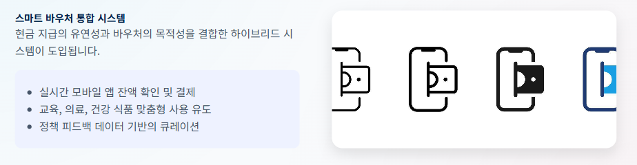 수당을 단순히 현금으로 꽂아주는 것을 넘어, 교육이나 건강 관리에 특화된 바우처 형태로 통합 관리하는 추세입니다.