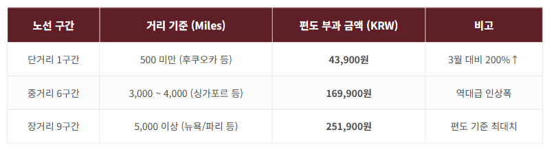 - 장거리 노선 (미주, 유럽, 대양주 등 5,000마일 이상): 편도 기준 251,900원 (3월 78,600원 대비 약 220% 인상)