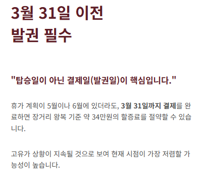 - 4월 이후 여행 예정이라면 반드시 3월 31일까지 발권을 완료하여 약 220%의 인상분을 피하시기 바랍니다.