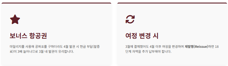 - 마일리지 항공권 포함: 유류할증료는 마일리지로 구매하는 보너스 항공권에도 동일하게 적용됩니다. 마일리지 좌석을 예약할 계획이라면 반드시 3월 내에 확약 및 결제까지 완료하시는 것이 좋습니다.