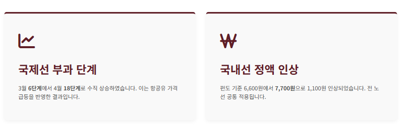 국내선 또한 유가 상승의 영향으로 소폭 인상되었습니다.