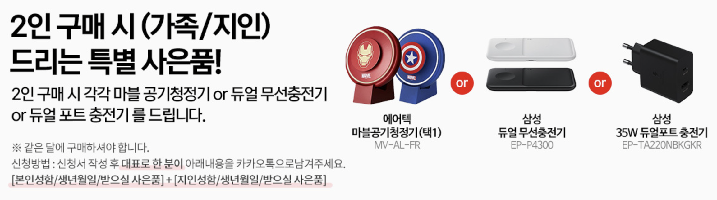 2인 구매시 드리는 특별 사은품을 줍니다. 에어텍 마블공기청정기와 삼성 듀얼 무선 충전기, 삼성 듀얼포트 충전기를 받을 수 있으니 놓치지 마세요!!