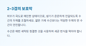 2. 청결 유지: 피부가 예민하므로 얼음팩을 감싸는 수건은 반드시 세탁된 깨끗한 것이어야 2차 감염을 예방할 수 있습니다.
