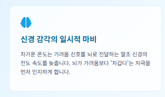 • 신경 감각의 일시적 마비: 차가운 온도는 가려움 신호를 뇌로 전달하는 말초 신경의 전도 속도를 늦춥니다. 뇌가 가려움보다 '차갑다'는 자극을 먼저 인지하게 하여 고통을 잊게 합니다.