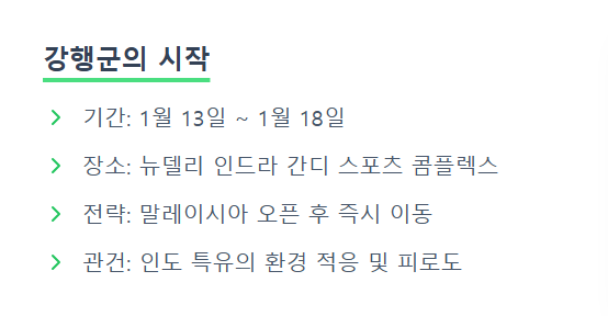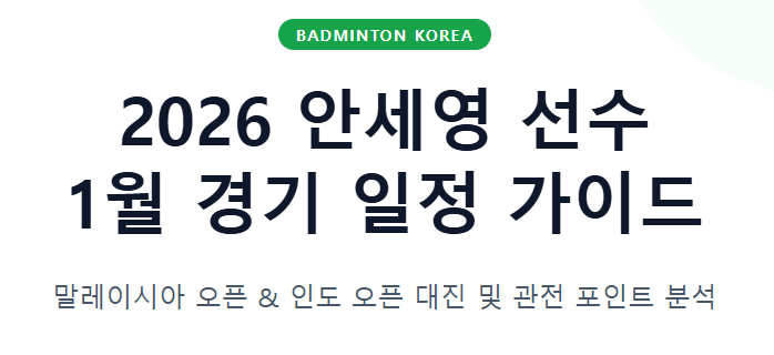 - 특징: 말레이시아 오픈 종료 직후 바로 이동하여 치르는 대회로, 체력 관리가 이번 1월 일정의 핵심 관건이 될 전망입니다.