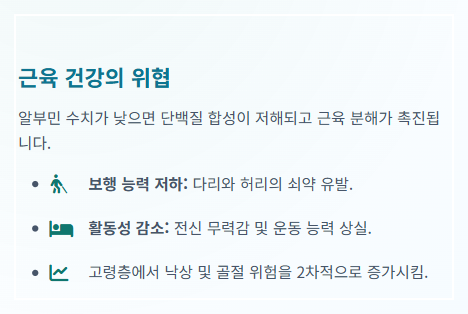 근감소증 유발: 알부민 부족은 근육 분해를 촉진하여 근감소증 위험을 높입니다. 이는 다리와 허리의 쇠약으로 이어져 보행 속도가 느려지고 오래 걷지 못하게 되는 등 운동 능력 저하를 야기합니다.