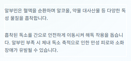 또한, 알부민은 체내 해독 시스템을 강력하게 지원합니다. 혈액을 순환하며 알코올, 약물 대사산물 등 다양한 독성 물질을 흡착하여 간으로 이동시키고 해독 작용을 돕습니다. 알부민이 제 기능을 다하지 못하면 노폐물 배출이나 독소 해독이 원활하지 않아 무력감, 심한 피로, 소화 장애 등의 전신 증상이 나타나게 됩니다.