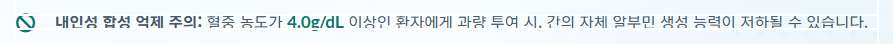 또한, 내인성 알부민 합성능 억제 위험성이 존재합니다. 혈청 알부민 농도가 이상인 환자에게 외인성 알부민을 투여할 경우, 내인성 알부민 합성이 억제될 수 있으므로, 용량 결정에 있어 환자의 현재 농도를 고려해야 합니다.마지막으로, 알부민은 단백질이므로 단백 변성의 우려 때문에 사용 시 체온 이상으로 너무 높은 온도에서 가온하지 않도록 주의해야 합니다.
