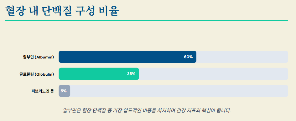 - 정의: 간에서 만들어져 혈액 속에 존재하는 혈청 단백질입니다. 전체 혈장 단백질의 약 60%를 차지합니다.